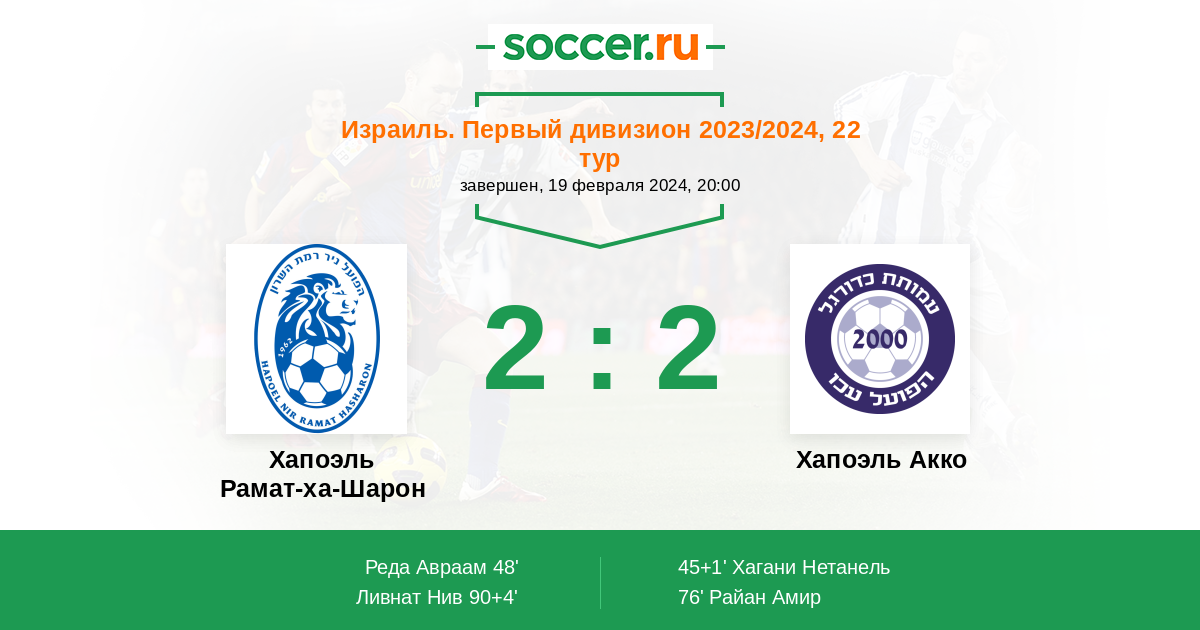 | Хапоэль Акко | 54:42 | 28:17 | 26:25 |