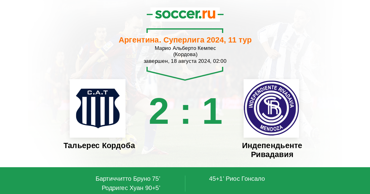 | Индепендьенте Ривадавия | 1:1 | 0:0 | 1:1 |