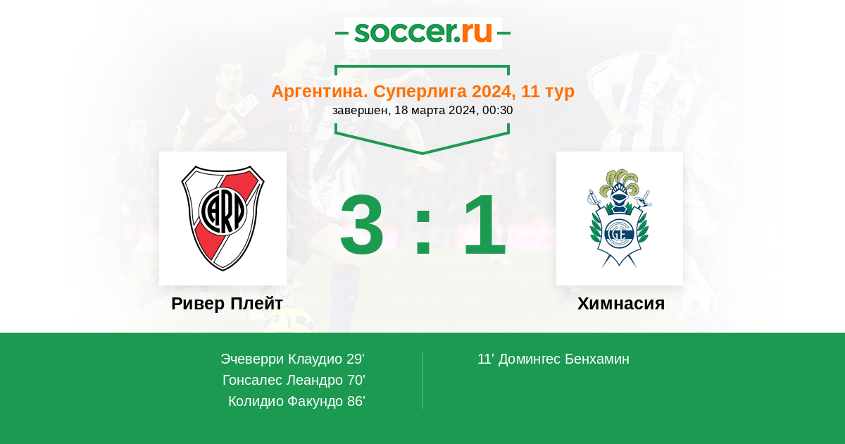 | Ривер Плейт | 34:13 | 17:4 | 17:9 |