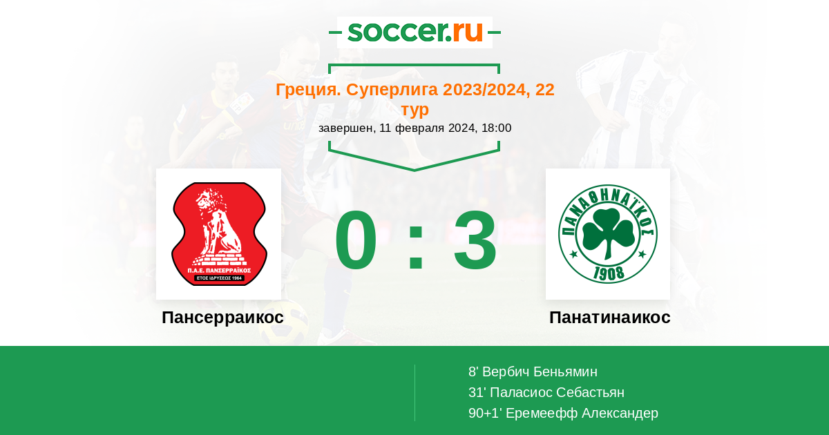 | Пансерраикос | 3:16 | 2:5 | 1:11 |