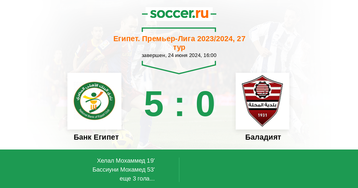 | Банк Египет | 2:0 | 0:0 | 2:0 |