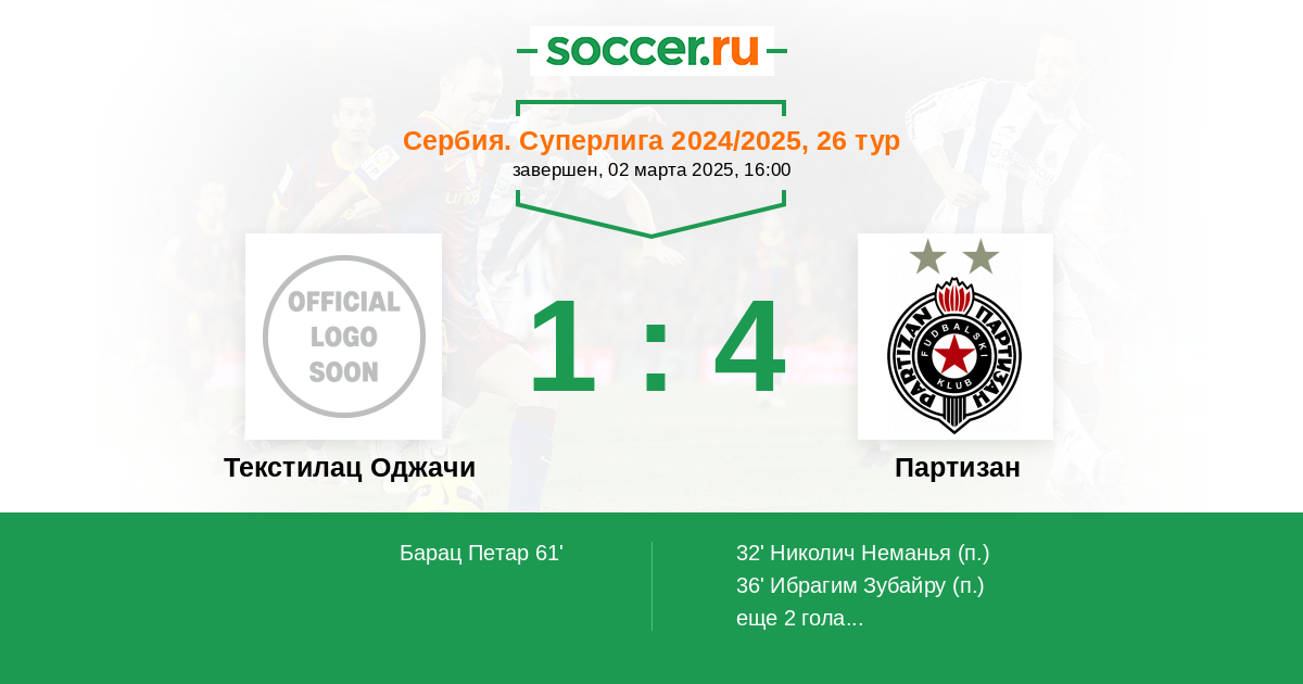 | Текстилац Оджачи | 1:4 | 0:0 | 1:4 |