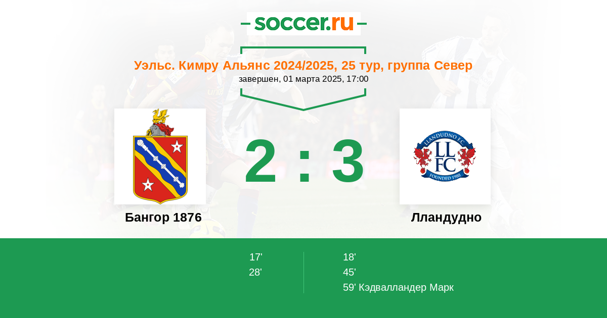 | Лландудно | 5:6 | 2:6 | 3:0 |