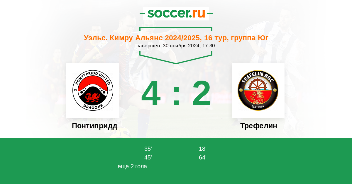 | Понтипридд | 7:7 | 2:1 | 5:6 |