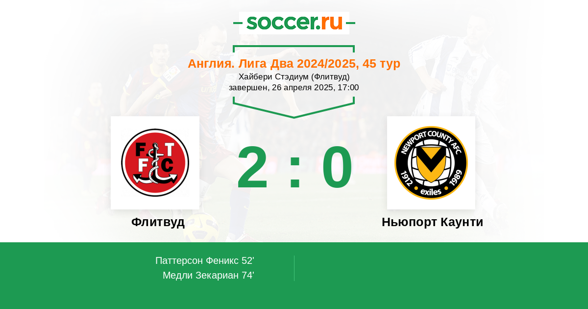 | Флитвуд | 2:0 | 0:0 | 2:0 |
