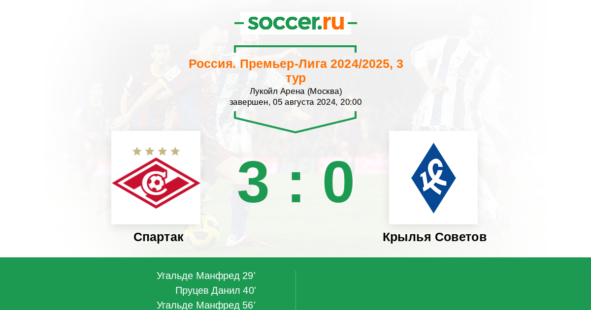 Не удивлюсь, если Спартак сегодня выиграет снова и с крупным счетом. В третьем туре лидеры легко и непринужденно обыграли своих соперников, забив им по пять! голов. Локомотив вообще отличился в гостях. Думаю, Станкович также захочет выиграть, тем более соперник подходящий. Крылья Советов идут пока на последнем месте. Вроде бы кого-то приобрели, но нужно время для сыгранности, а его нет. Так что ждем много голов, а победа , к примеру, со счетом 1-0 будет выглядеть кисло, хотя очки, как известно, не пахнут.