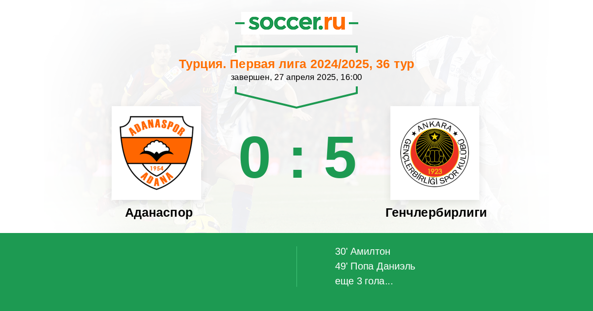 | Аданаспор | 24:40 | 10:21 | 14:19 |