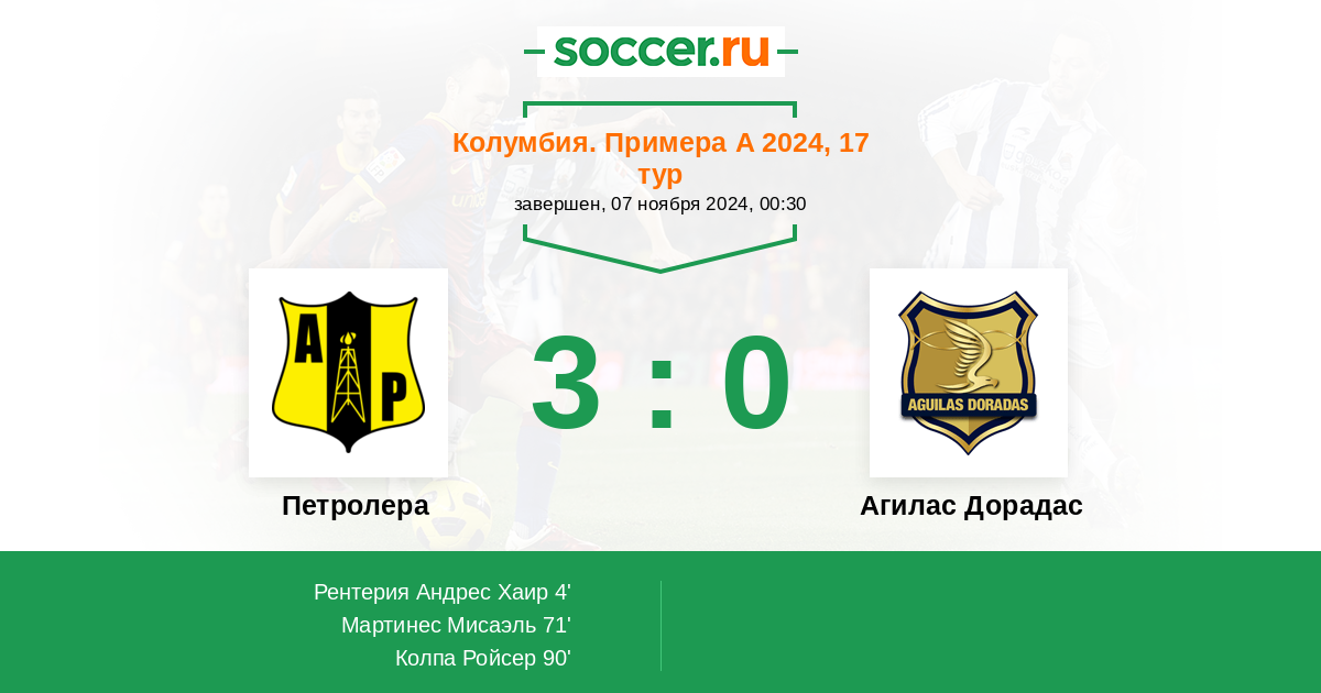 | Колумбия. Примера А | 26 | 12 | 9 | 5 |