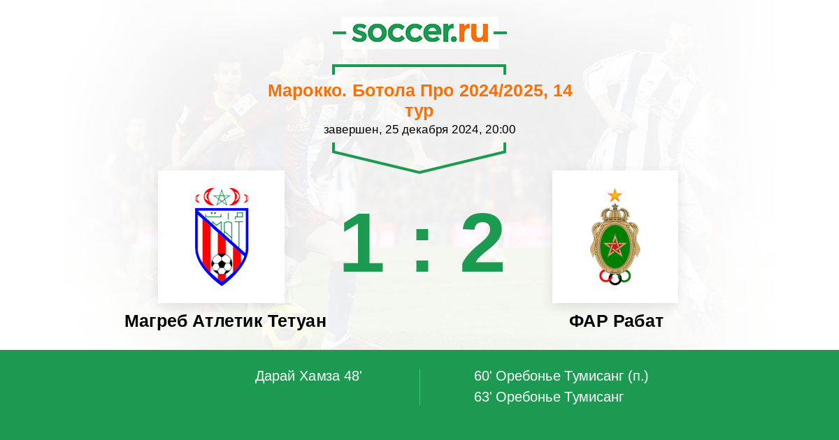 | Магреб Атлетик Тетуан | 40:40 | 18:11 | 22:29 |