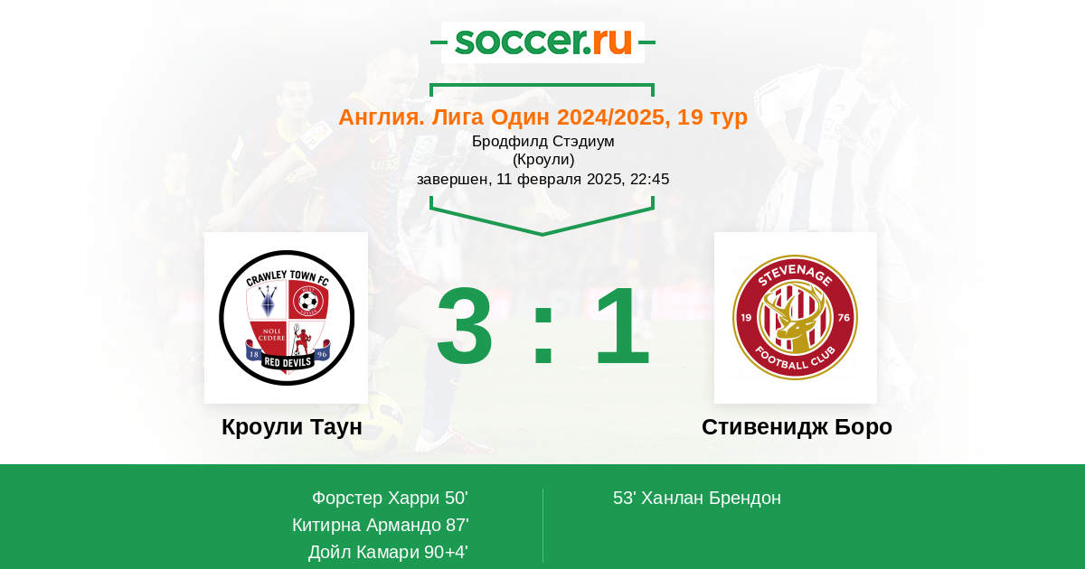 | Кроули Таун | 37:53 | 19:23 | 18:30 |