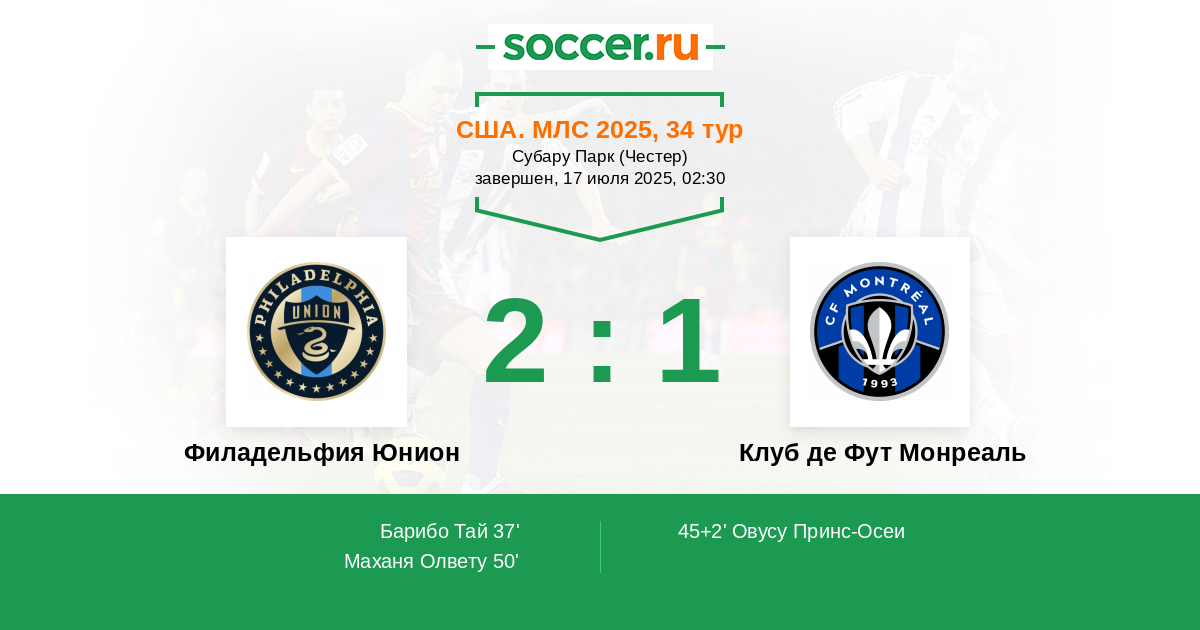 | Филадельфия Юнион | 49:56 | 24:21 | 25:35 |