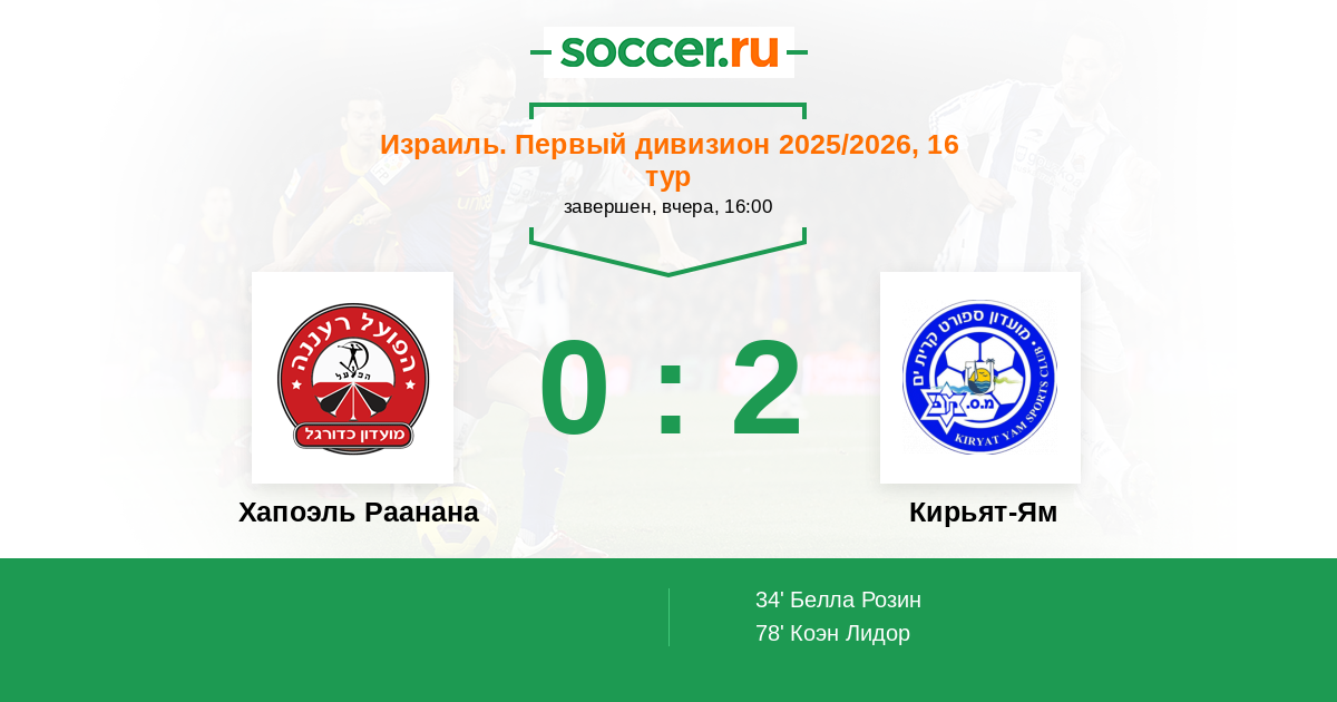| Хапоэль Раанана | 0:4 | 0:0 | 0:4 |