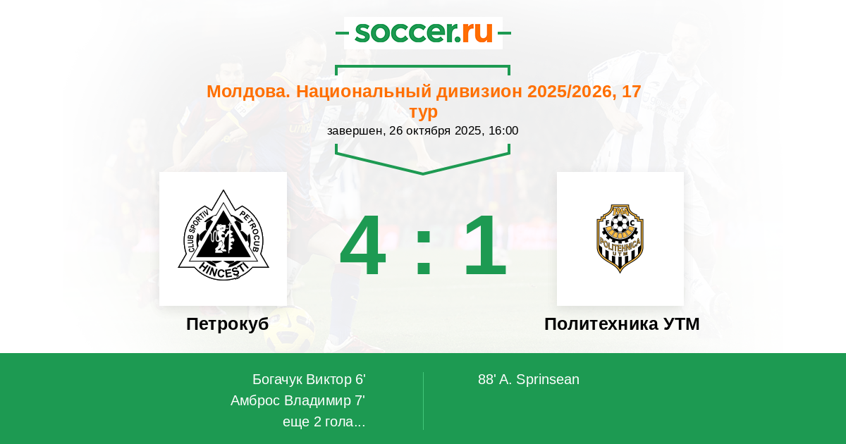| Молдова. Национальный дивизион | 2 | 2 | 0 | 0 |