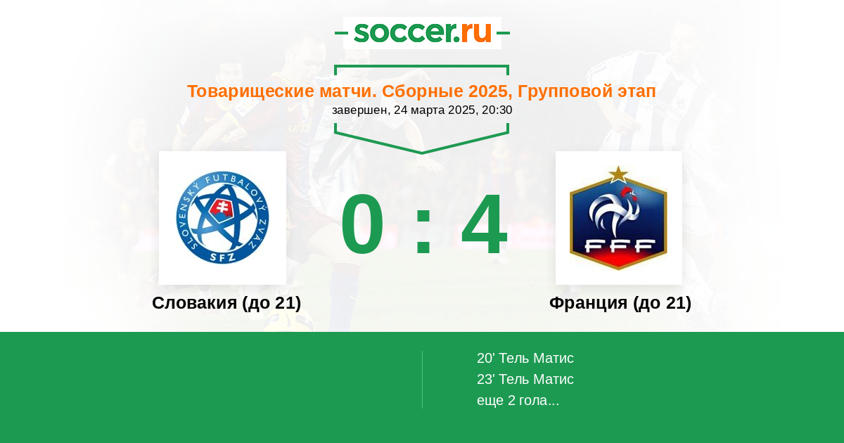 | Франция (до 21) | 6:3 | 1:0 | 5:3 |