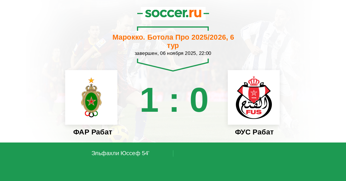 | ФУС Рабат | 35:42 | 19:24 | 16:18 |