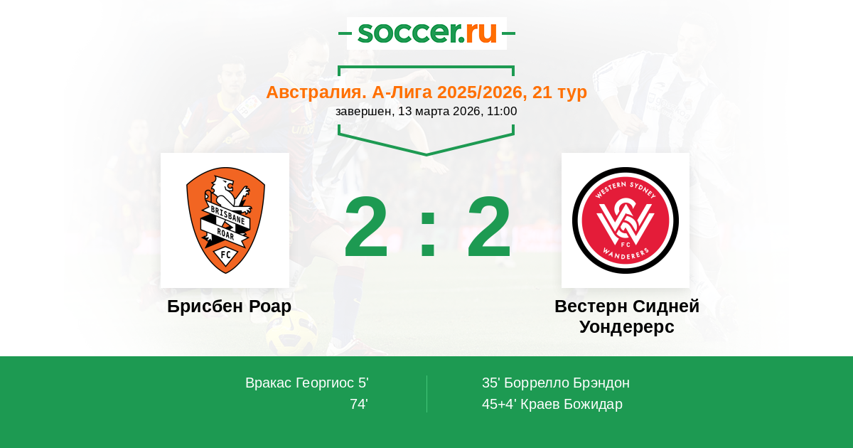| Брисбен Роар | 53:55 | 27:28 | 26:27 |