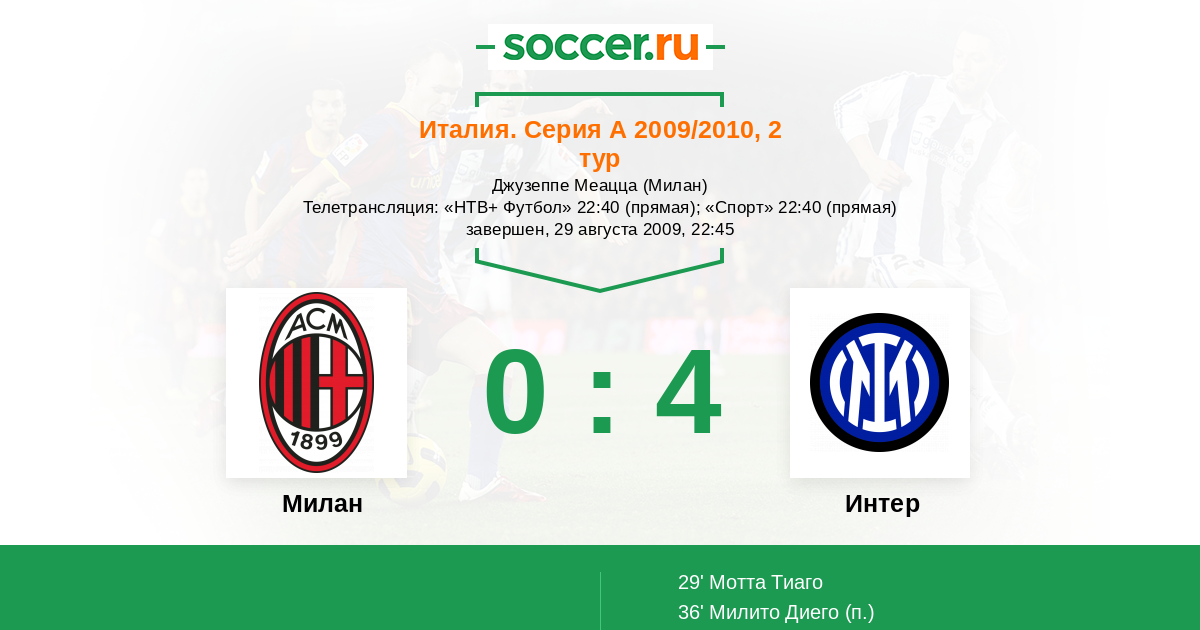 Милан, Джузеппе Меацца Телетрансляция: "НТВ+ Футбол" 22:40 (прямая); "Спорт" 22:40 (прямая)