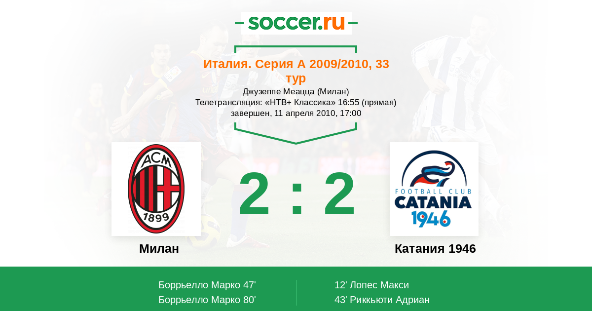Милан, Джузеппе Меацца Телетрансляция: "НТВ+ Классика" 16:55 (прямая)