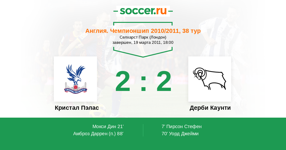 | Кристал Пэлас | 41:44 | 22:10 | 19:34 |