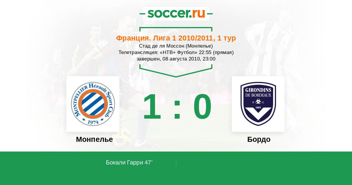 Монпелье, Стад де ля Моссон Телетрансляция: "НТВ+ Футбол" 22:55 (прямая)