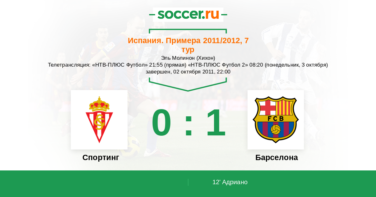 Хихон, Эль Молинон Телетрансляция: "НТВ-ПЛЮС Футбол" 21:55 (прямая) "НТВ-ПЛЮС Футбол 2" 08:20 (понедельник, 3 октября)