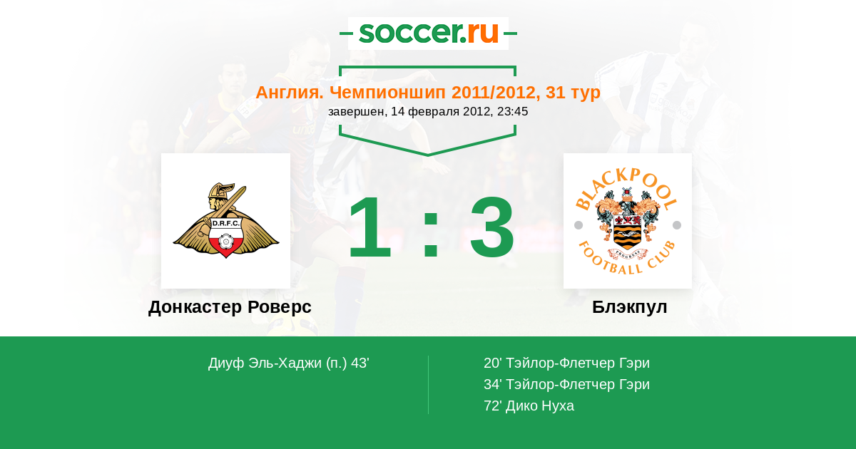 | Донкастер Роверс | 36:43 | 20:19 | 16:24 |