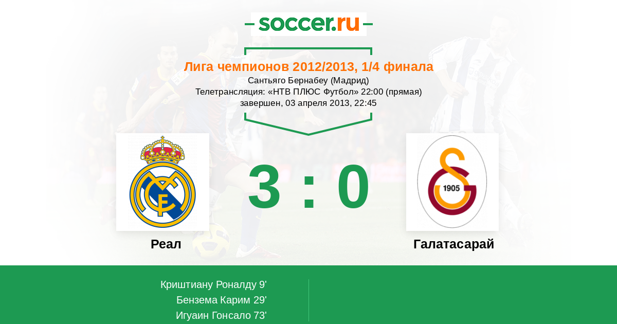 Мадрид, Сантьяго Бернабеу Телетрансляция: "НТВ ПЛЮС Футбол" 22:00 (прямая)