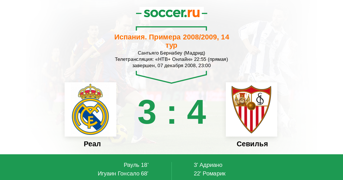 Мадрид, Сантьяго Бернабеу, зрителей: 68000 Телетрансляция: "НТВ+ Онлайн" 22:55 (прямая)