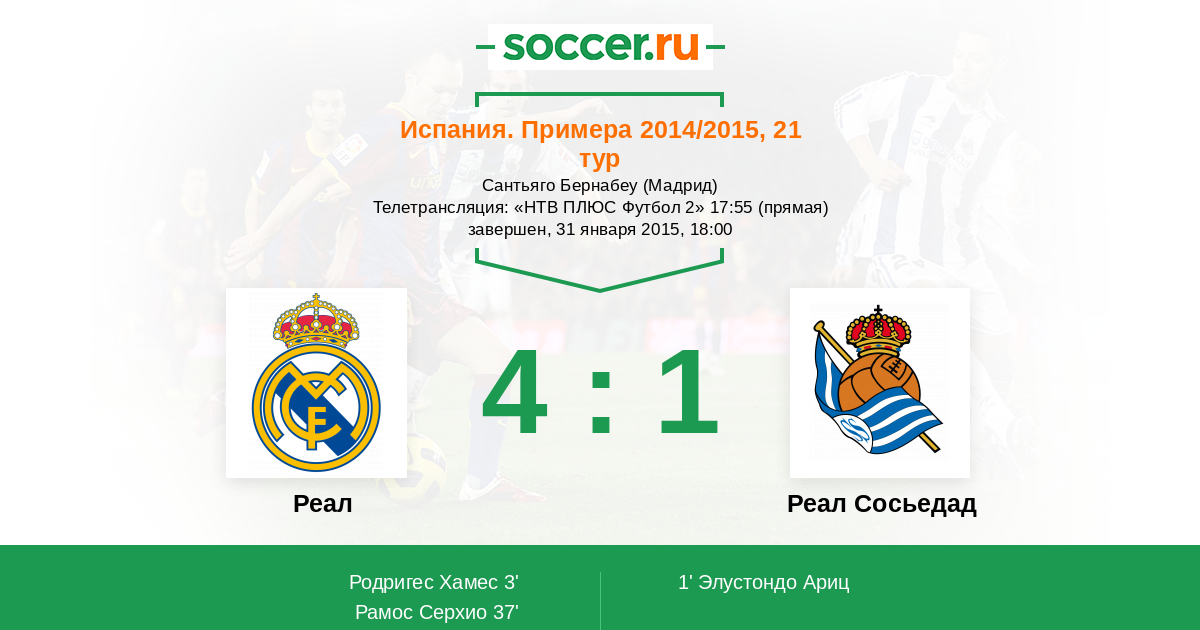 Мадрид, Сантьяго Бернабеу Телетрансляция: "НТВ ПЛЮС Футбол 2" 17:55 (прямая)