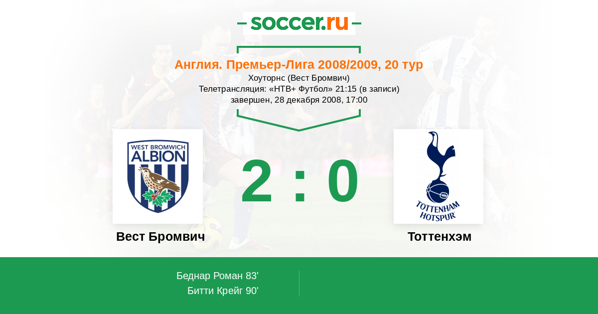 Вест Бромвич, Хоуторнс Телетрансляция: "НТВ+ Футбол" 21:15 (в записи)