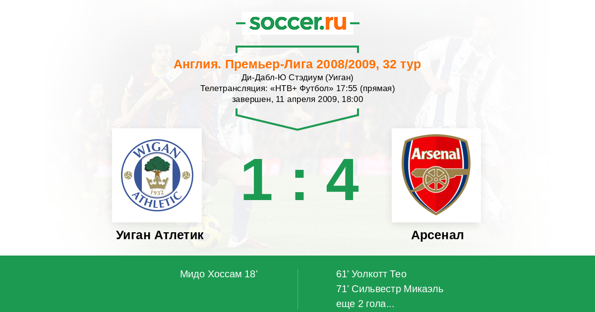 Уиган, Ди-Дабл-Ю Стэдиум Телетрансляция: "НТВ+ Футбол" 17:55 (прямая)