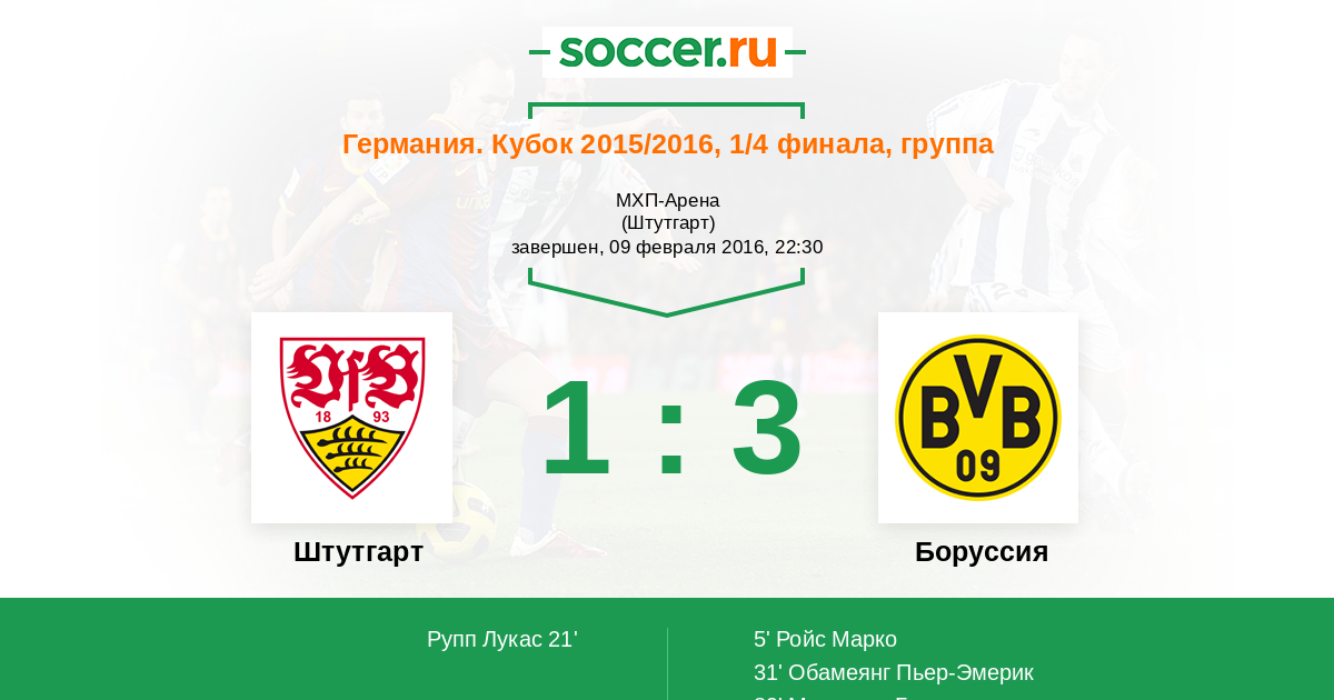 Запасные: 14 Ляйтнер Мориц (с 77'), 23 Кагава Синдзи (с 87'), 1 Вайденфеллер Роман, 4 Суботич Невен, 22 Пулишич Кристиан, 27 Кастро Гонсало, 33 Вайгль Юлиан