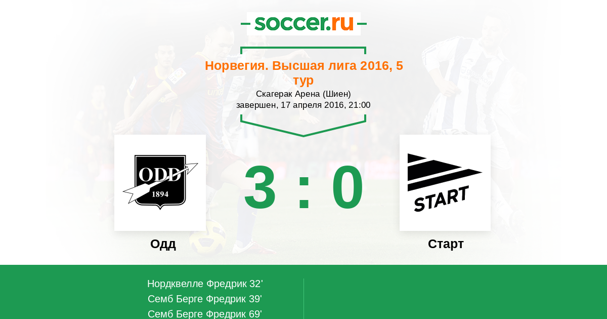 32' (1:0) Нордквелле Фредрик (14) (Рууд Эспен (2))
