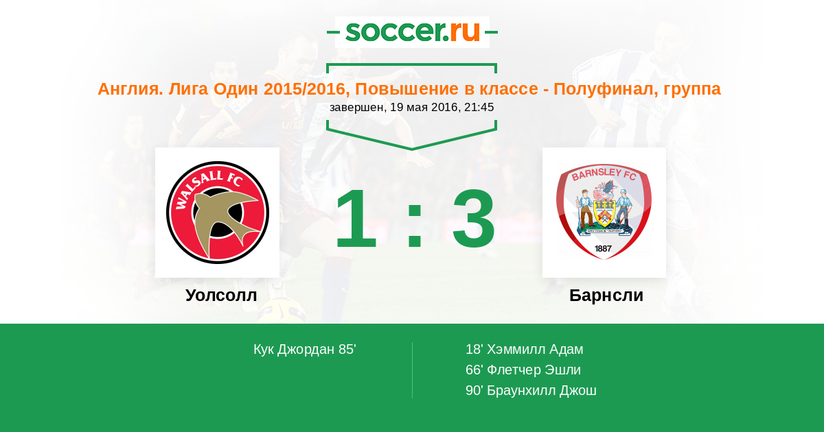 18' (0:1) Хэммилл Адам (20) (Флетчер Эшли (18))