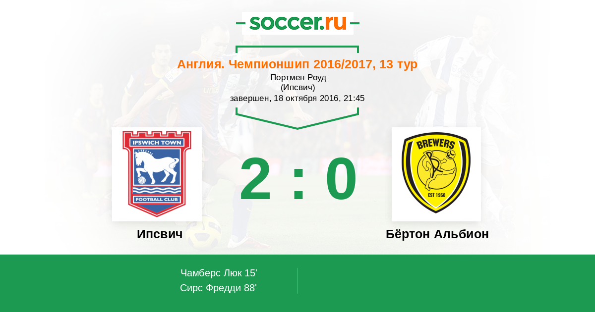15' (1:0) Чамберс Люк (4) (Сирс Фредди (20))