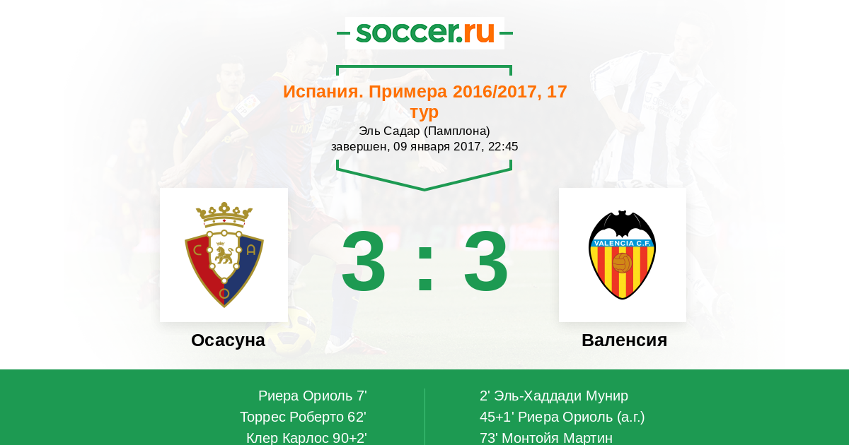 45+1' (1:2) Автогол Риера Ориоль (9)
