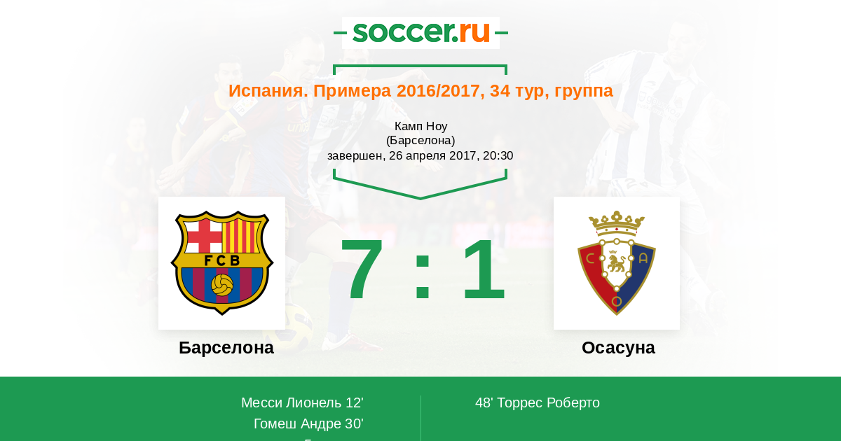 Запасные: 13 Силлессен Яспер, 23 Умтити Самюэль, 18 Альба Жорди, 20 Роберто Серхи, 8 Иньеста Андрес, 28 Аленья Карлес (с 63'), 9 Суарес Луис