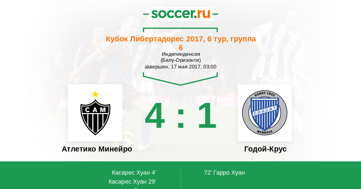 4' (1:0) Касарес Хуан (10) (Маркос Роча (2))