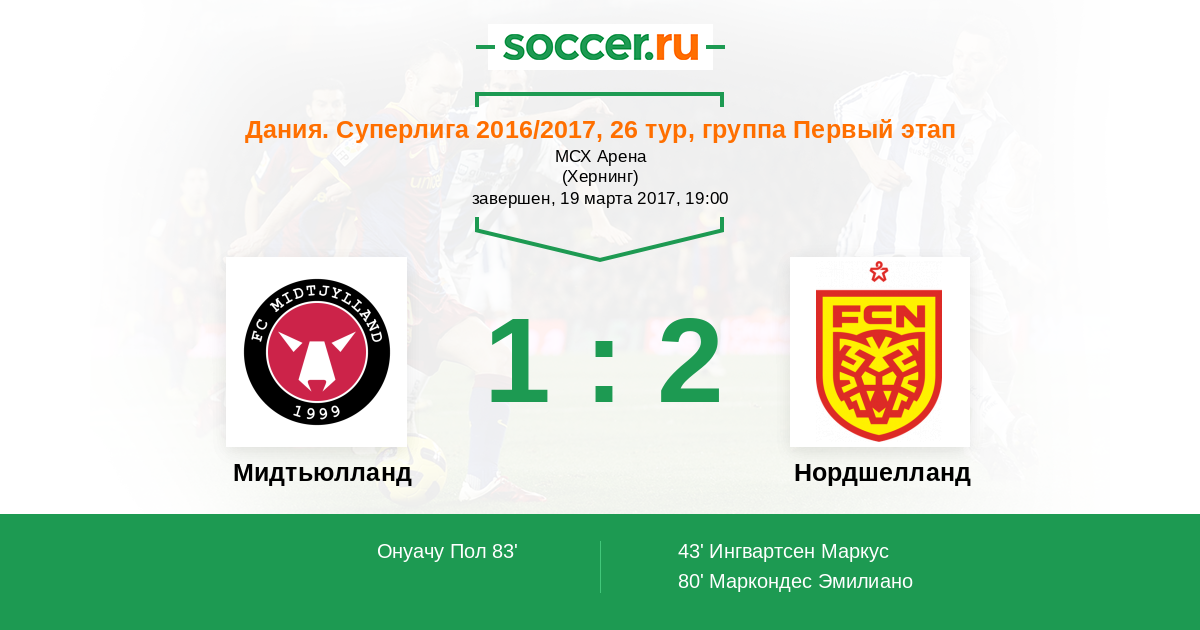 43' (0:1) Ингвартсен Маркус (19)