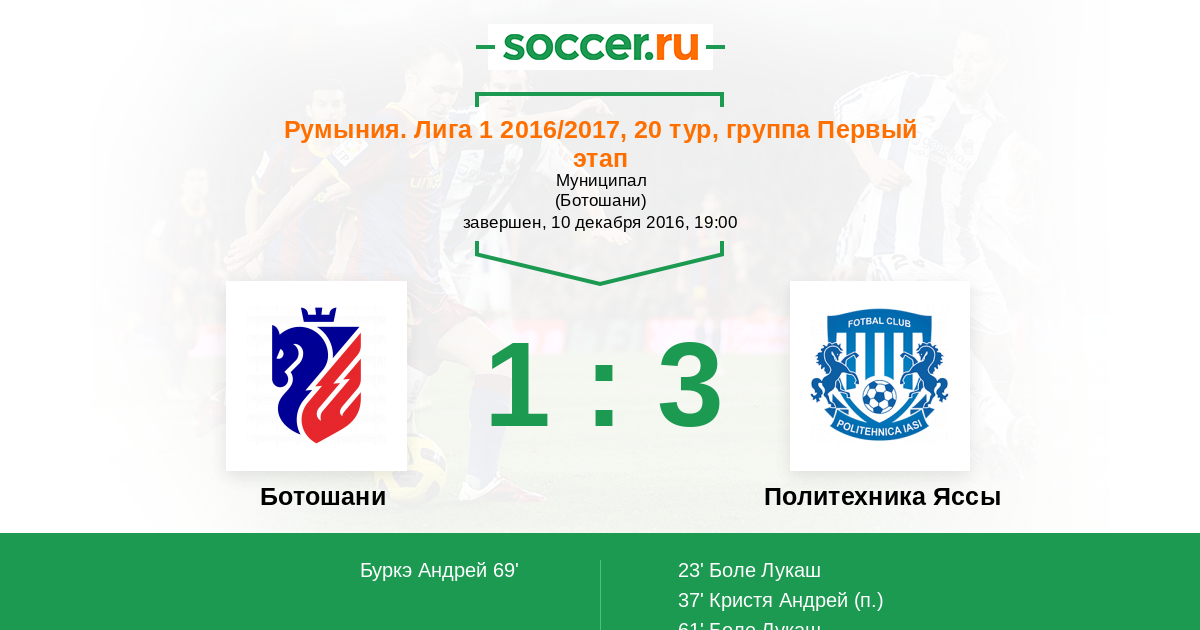 Запасные: 5 Пламада Флорин (с 45'), 21 Астафей Виктор (с 64'), 27 Хергелгиу Андрей (с 80'), 11 Моруцан Олимпу, 12 Альбу Септимий, 17 Куку Стелиан, 88 Димитров Радослав