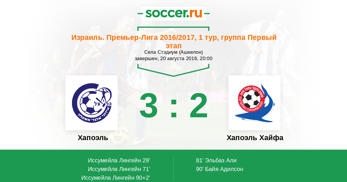 Запасные: 14 Эльбаз Али (с 46'), 11 Лала Мааран (с 68'), 18 Идан Голан (с 74'), 16 Пиньейру Бруно, 6 Вазао Маконант, 1 Левкович Руби, 26 Дора Йосси