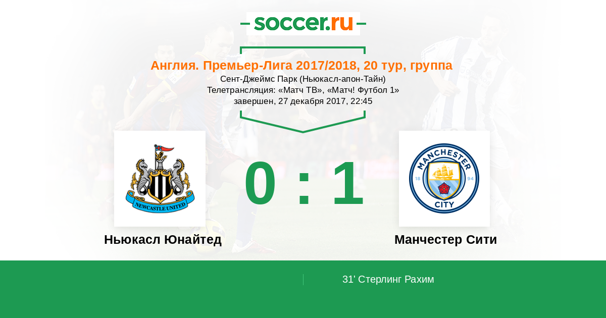 31' (0:1) Стерлинг Рахим (7) (Де Брюйне Кевин (17))