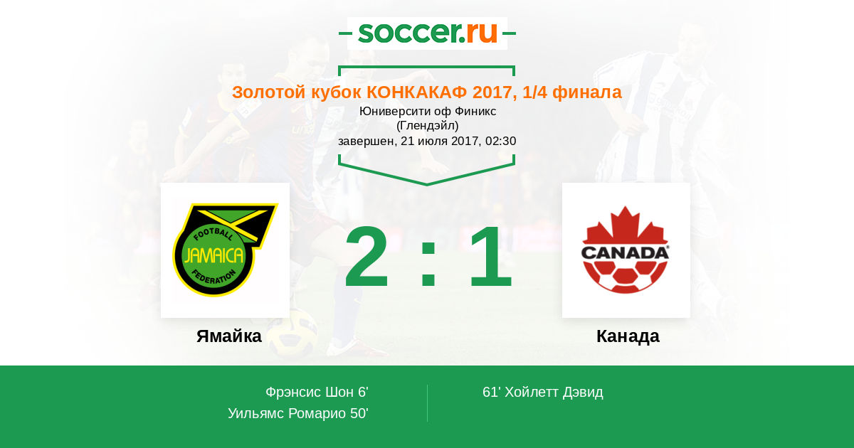 Запасные: 11 Берк Кори (с 67'), 4 Ричи Ладэйл (с 81'), 12 Биннс Майкл (с 90+2'), 2 Харриотт Росарио, 6 Кэмпбелл Серхио, 8 Фишер Ониел, 9 Грандисон Эван, 13 Миллер Дуэйн, 14 Николсон Шамар, 16 Джонсон Джермейн, 19 Моррис Рикардо, 23 Хайатт Дамион
