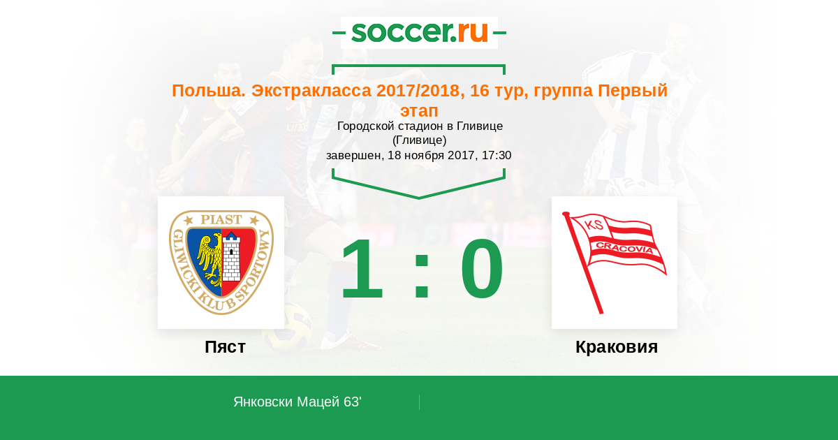 63' (1:0) Янковски Мацей (7) (Кончковски Мартин (20))