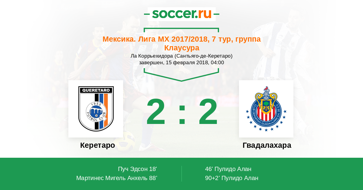 90+2' (2:2) Пулидо Алан (9) (Сиснерос Роналдо (29))