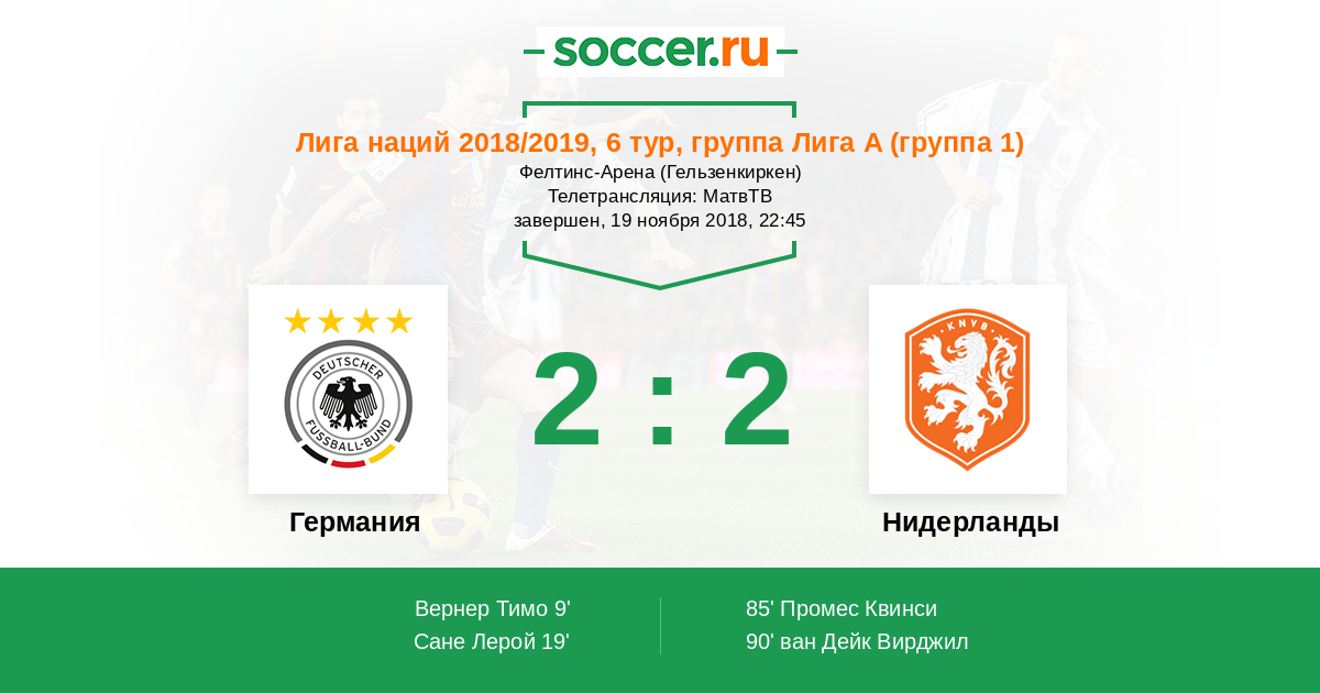 Запасные: 13 Зут Йерун, 23 Бизот Марко, 12 Думфрис Дензел, 14 де Врей Стефан, 15 Аке Натан, 16 Стротман Кевин, 17 ван де Бек Донни, 18 Росарио Пабло, 19 Де Йонг Люк (с 66'), 20 Дилросун Джавайро (с 45'), 21 Вильена Тонни (с 60'), 22 Ван Анхольт Патрик