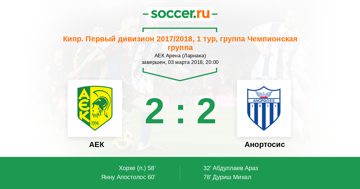 Запасные: 23 Экономидес Гиоргос (с 54'), 20 Камара Абубакар (с 74'), 2 Коффи Эрнан (с 85'), 12 Пилеас Костас, 40 Маттэу Николас, 44 Корреа Павлос, 91 Пападопулос Гиоргос