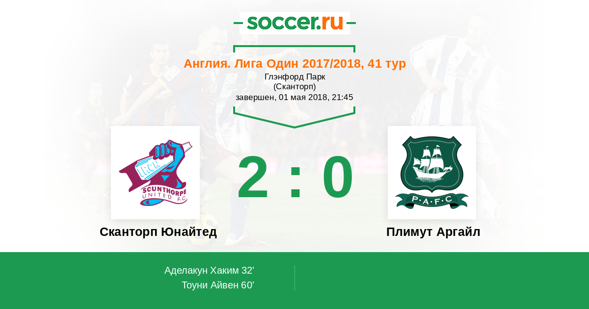 32' (1:0) Аделакун Хаким (16) (Уоллес Мюррей (5))