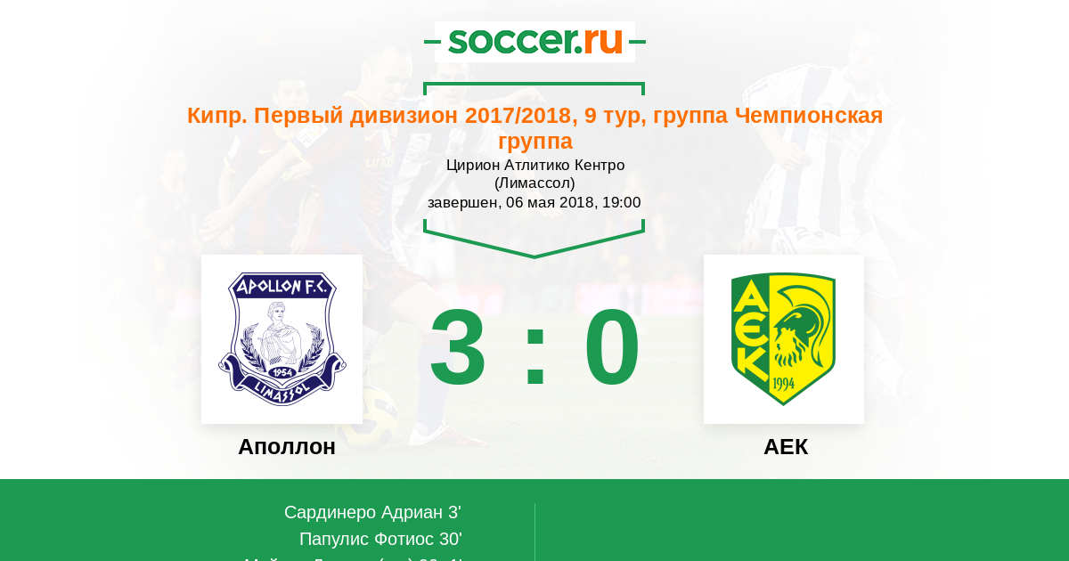Запасные: 10 Томас Жоан (с 46'), 80 Рушиас Онисифорос (с 64'), 16 Касес Начо (с 75'), 2 Сория Карлес, 3 Антониадес Мариос, 4 Труйолс Хоан, 15 Хуан Пабло, 22 Малоку Эльвир, 28 Панайидис Иоаннис, 35 Панков Радован, 40 Михаэль Яннис
