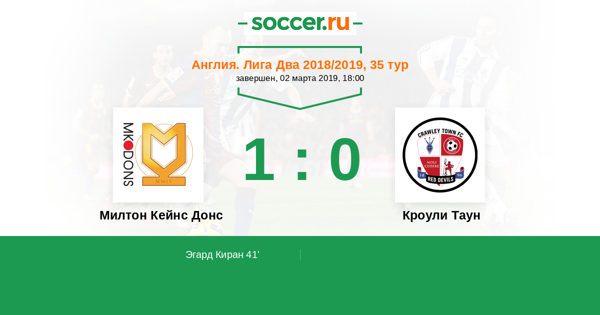 41' (1:0) Эгард Киран (14) (Мур Стюарт (22))